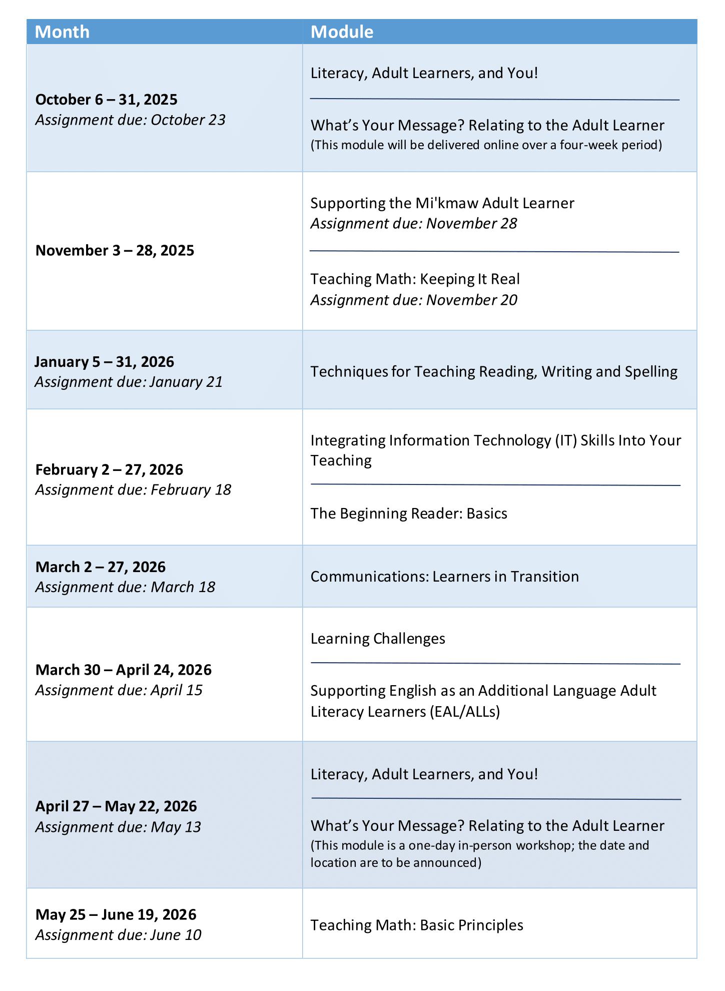 *Program Update: Starting September 1, 2025, practitioners seeking certification will be required to complete the new module, "Supporting the Mi'kmaw Adult Learner."